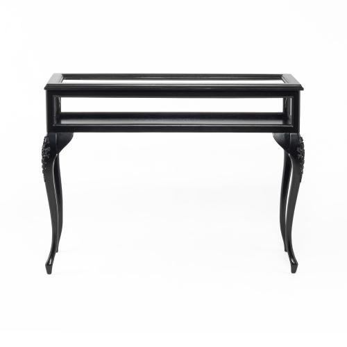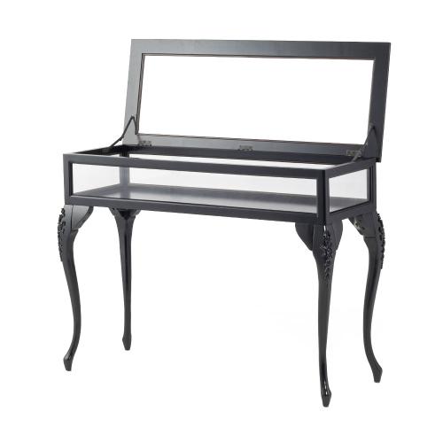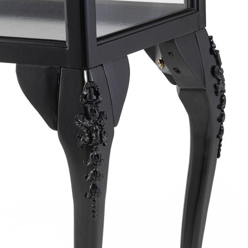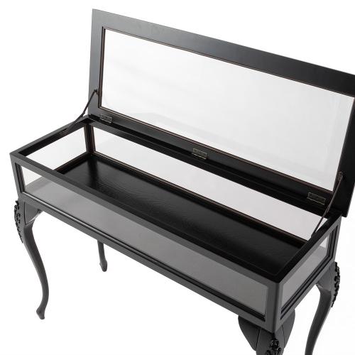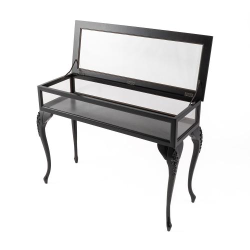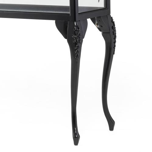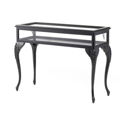 優雅な猫脚とシックなブラックフレームが目を引く、フレンチスタイルのショーケースです。