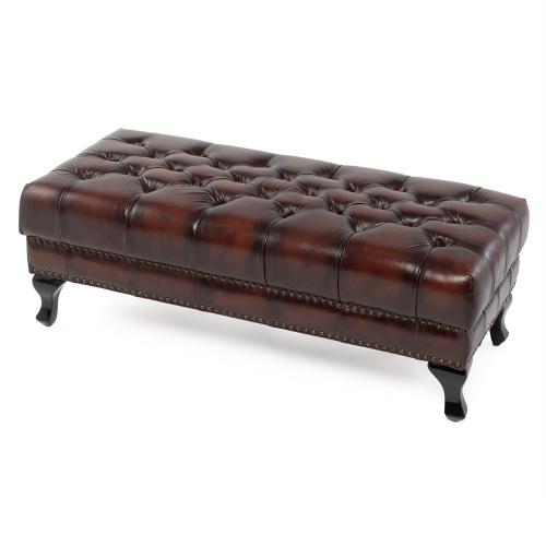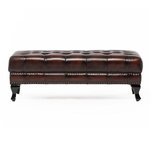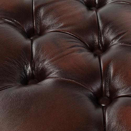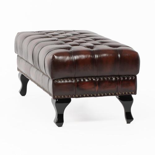 英国の伝統的なスタイルを取り入れたチェスターフィールドのオットマン・ベンチ(スツール)です。クラシックで重厚感のあるデザインが特徴で、リビングやベッドルーム、あるいは店舗の什器としても映える一品ですね。