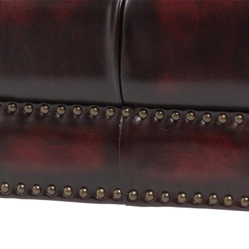 ボルドー(ワインレッド)系の本革に、濃淡のあるアンティーク加工が施されており、使い込まれたような深みのある風合いが表現されています。